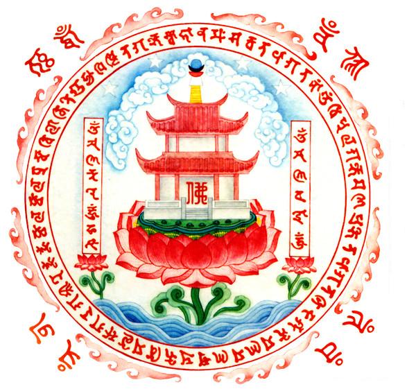 2.蓮花上有一寶塔,臨終時置於胸前,其方向為塔尖向上。此寶塔能令一切惡業皆得消滅,決定當得無上